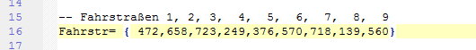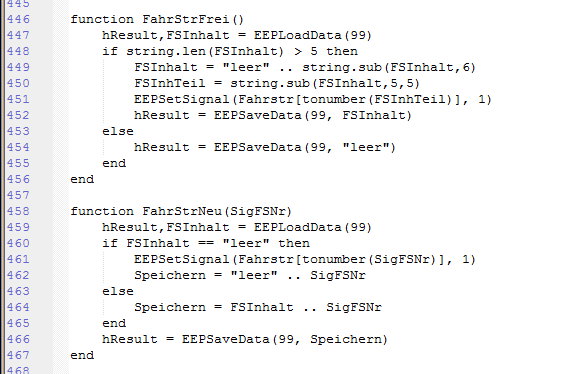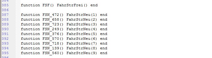 Es folgt der Endkontakt, er befindet sich immer am Ende des einzelnen Weges, wobei es unerheblich ist, welchen Weg es betrifft, deshalb ohne zusätzliche Ziffer. Dann folgen die 9 Eingangskontakte, immer mit der Ziffer des Signals bezeichnet zum besseren zuordnen. In der Funktion function FSN_472() wird übersetzt nach FahrStrNeu(1). Die Funktion FahrStrNeu gilt dann für alle Anmeldekontakte, mit den entsprechenden Ziffern in der Klammer.