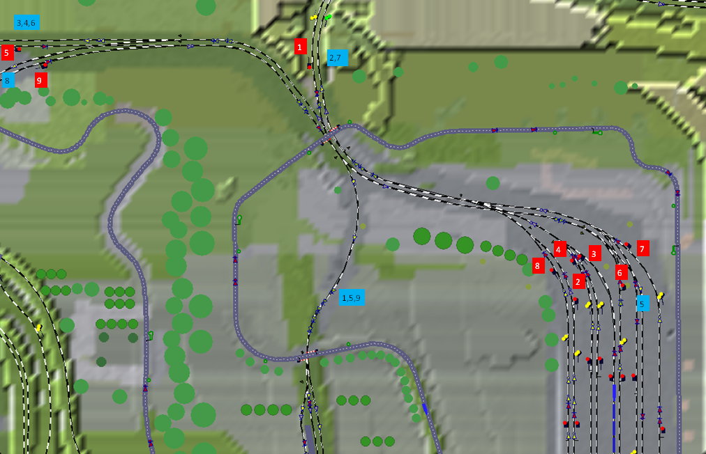 Auf dem folgenen Bild ist zu erkennen, dass es sich um 9 Wege handelt, dabei werden 5 und 9 von mehreren Zügen genutzt. Die roten Schilder zeigen die Eingangssignale an, die blauen den Verlauf, beim Verlassen des entsprechenden Wegs wird ein Endkontakt überfahren, der die Strecke jetzt wieder für den nächsten Zug freigibt.